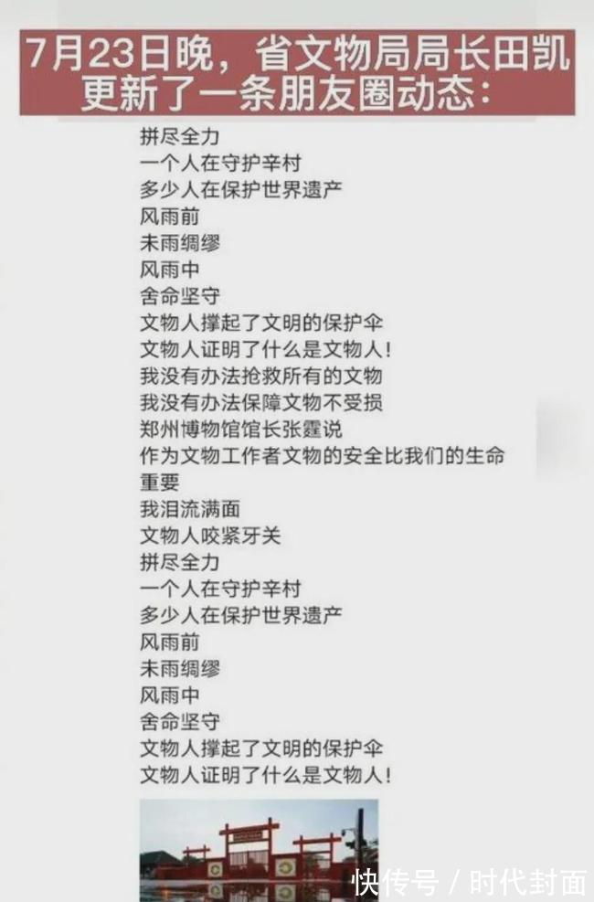 近日,一则名为“河南文物局局长哭了”的热搜话题引发网友热议。据悉,7月23日晚,河南省文物局局长田凯在朋友圈发表了一条动态称:“文物人太累了,我没有办法抢救所有的文物我没有办法保障文物不受损,郑州博物馆馆长张霆说,作为文物工作者文物的安全比我们的生命重要,我泪流满面………”